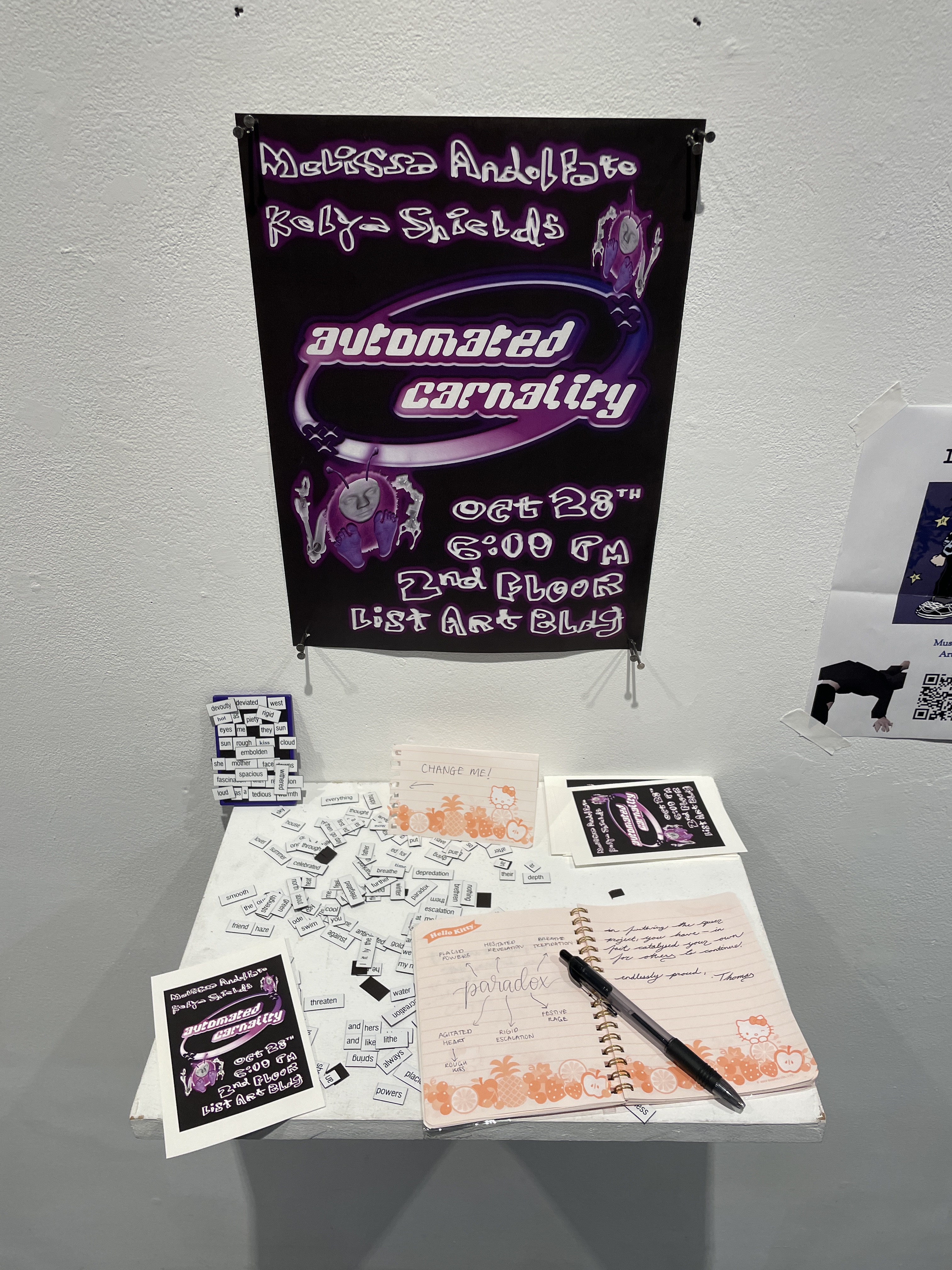 Automated Carnalities is a show I co-created with Melissa Andolfato, exhibited in the List Art Building in October 2022. Some of the work exhibited here was reconfigured for an installation piece later that year.
